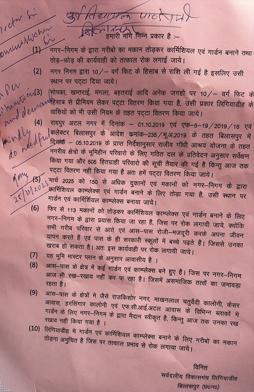 बिलासपुर। लिंगियाडीह क्षेत्र में नगर-निगम की ओर से गरीब परिवारों के मकान तोड़ने और गार्डन व कमर्शियल कॉम्प्लेक्स निर्माण की तैयारी को लेकर आज क्षेत्र में भारी आक्रोश देखने को मिला। सर्वदलीय विकास मंच लिंगियाडीह के नेतृत्व में बड़ी संख्या में लोग एकत्र हुए और विरोध प्रदर्शन किया। मंच के प्रतिनिधियों ने अपनी 10 सूत्रीय मांगों वाला ज्ञापन पूर्व विधायक शैलेश पांडेय को सौंपा, जिसे उन्होंने आगे बिलासपुर कलेक्टर और नगर निगम कमिश्नर को प्रेषित किया।