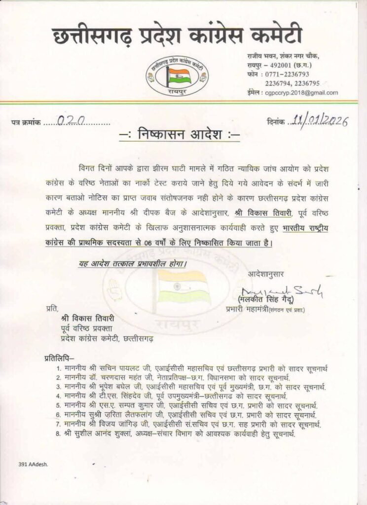प्रदेश कांग्रेस अध्यक्ष दीपक बैज के निर्देश पर यह अनुशासनात्मक कार्रवाई की गई है। आदेश में स्पष्ट किया गया है कि पार्टी के खिलाफ अनुशासनहीन आचरण को गंभीरता से लेते हुए भारतीय राष्ट्रीय कांग्रेस की प्राथमिक सदस्यता से निष्कासन का निर्णय लिया गया।