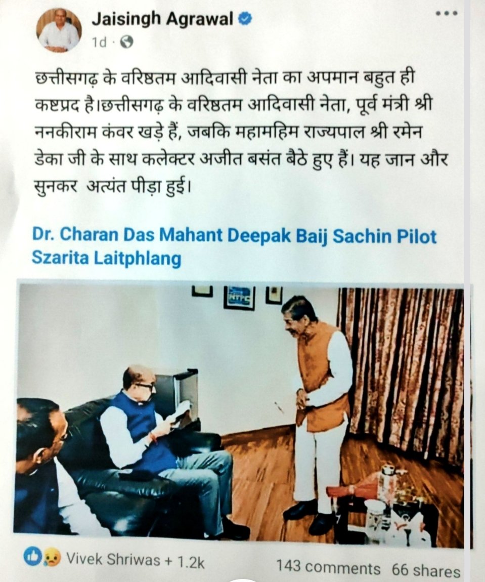 “छत्तीसगढ़ के वरिष्ठतम आदिवासी नेता का अपमान बहुत ही कष्टप्रद है। छत्तीसगढ़ के वरिष्ठतम आदिवासी नेता,पूर्व गृहमंत्री श्री ननकीराम कंवर खड़े है, जबकि महामहिम राज्यपाल श्री रमेन डेका जी के साथ कलेक्टर अजीत वसंत बैठे हुए है। यह जान और सुनकर अत्यंत पीड़ा हुई।”