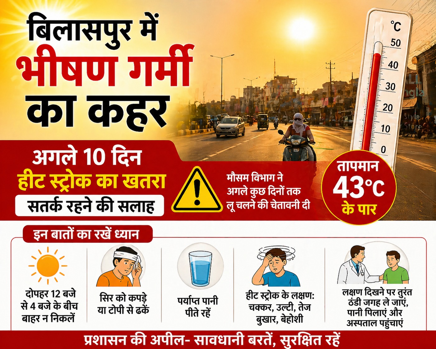बिलासपुर, 25 अप्रैल 2026. शहर में गर्मी ने अब खतरनाक रूप ले लिया है। तापमान 43 डिग्री सेल्सियस के पार पहुंच चुका है और लगातार बढ़ती गर्म हवाओं के चलते जनजीवन प्रभावित होने लगा है। मौसम विभाग ने आने वाले कुछ दिनों तक लू चलने की चेतावनी जारी की है। ऐसे में डॉक्टरों और प्रशासन ने लोगों को सतर्क रहने की सख्त सलाह दी है, क्योंकि अगले 10 दिनों तक हीट स्ट्रोक का गंभीर खतरा बना रह सकता है।