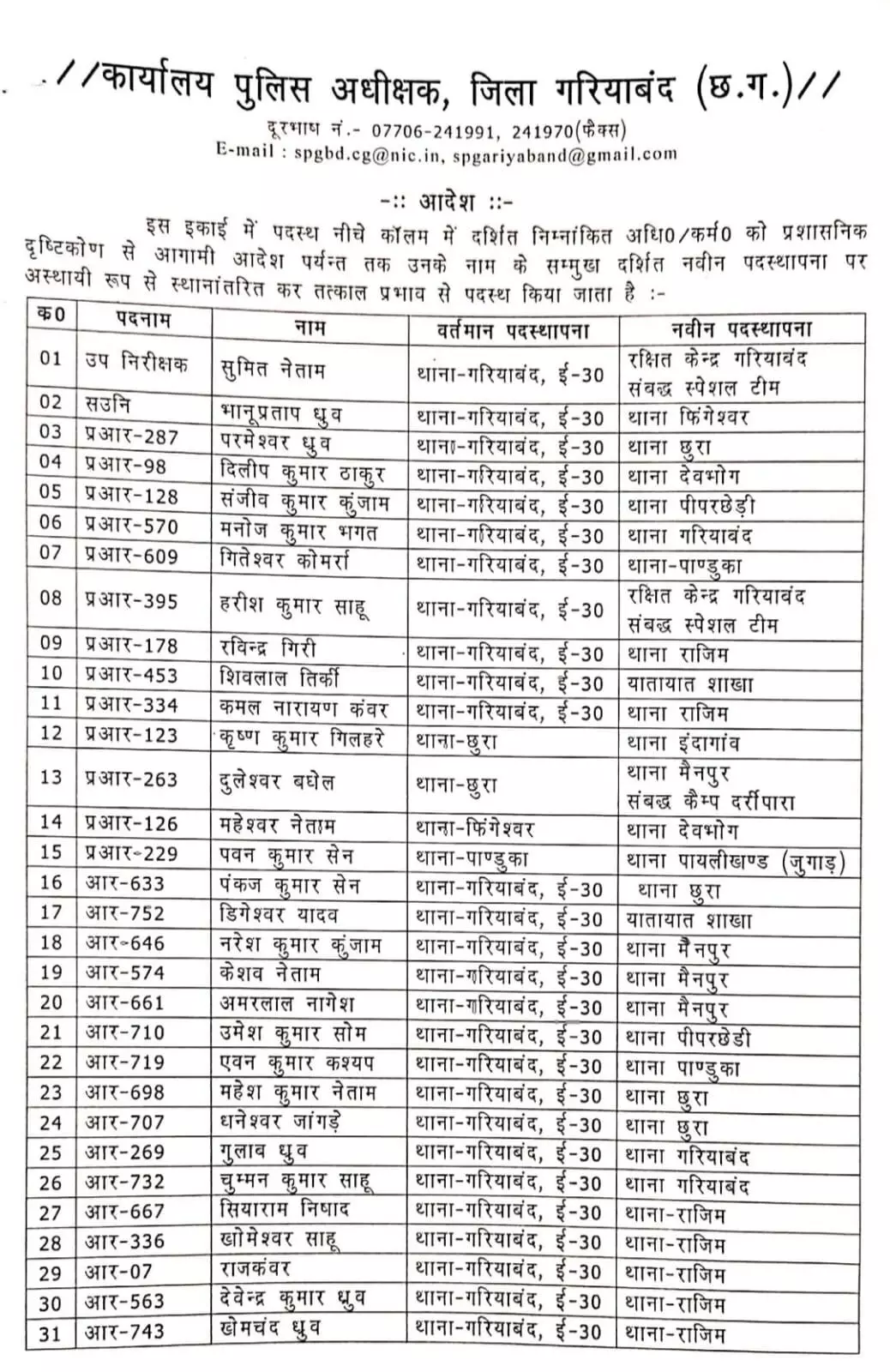 गरियाबंद। छत्तीसगढ़ के गरियाबंद जिले में पुलिस विभाग में बड़ा प्रशासनिक फेरबदल किया गया है। पुलिस अधीक्षक (SP) ने 40 पुलिसकर्मियों की ट्रांसफर सूची जारी की है।