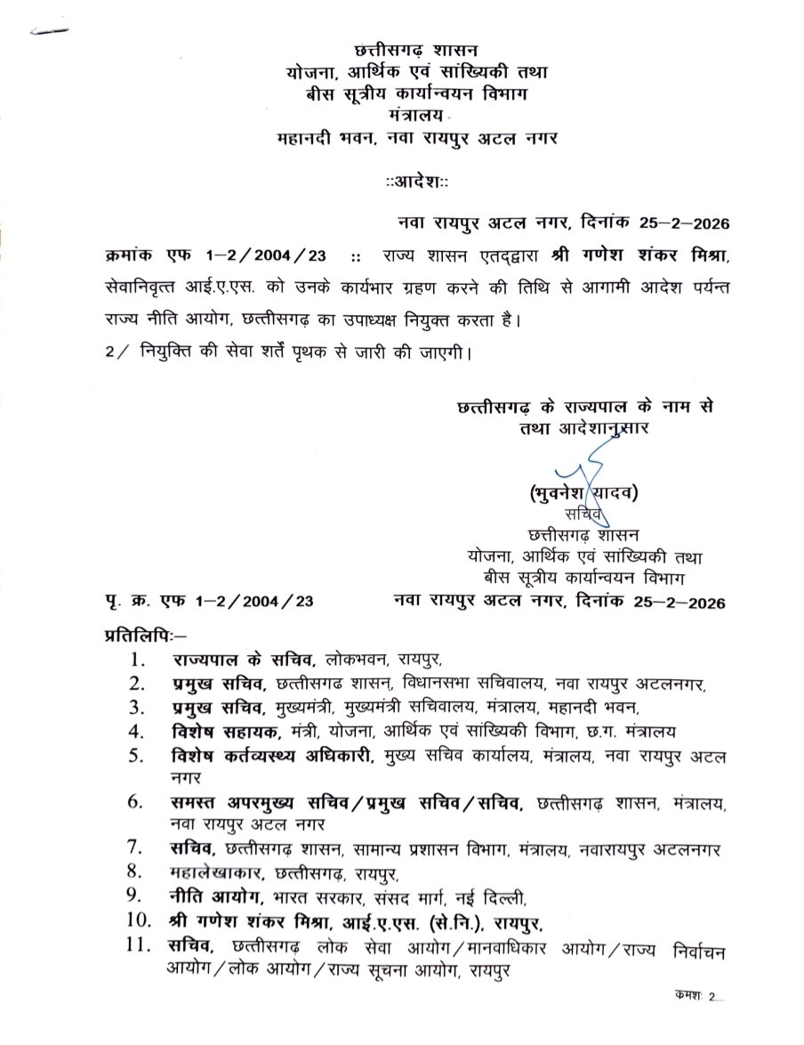 रायपुर, 26 फरवरी 2026। छत्तीसगढ़ शासन के योजना, आर्थिक एवं सांख्यिकी तथा बीस सूत्रीय कार्यान्वयन विभाग द्वारा जारी आदेश के तहत सेवानिवृत्त आईएएस अधिकारी  गणेश शंकर मिश्रा को राज्य नीति आयोग, छत्तीसगढ़ का उपाध्यक्ष नियुक्त किया गया है।