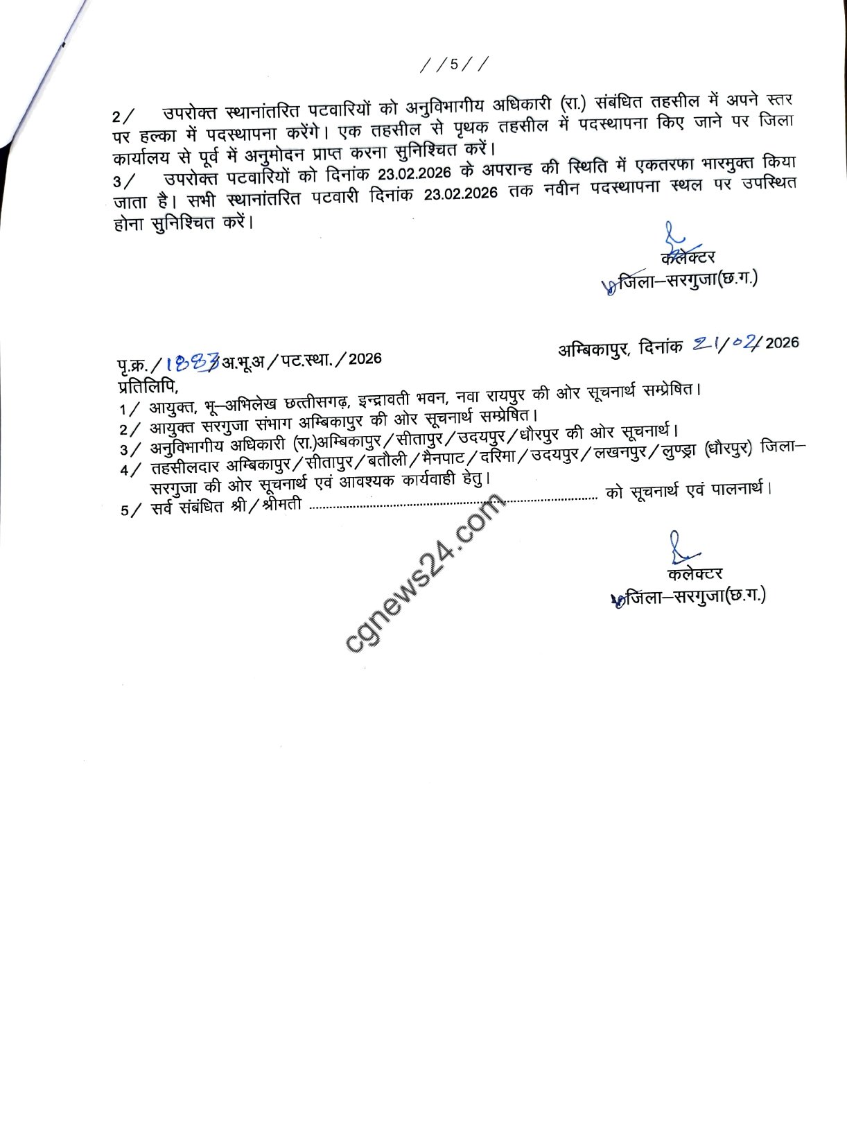 सरगुजा, 21 फरवरी 2026। कलेक्टर अंबिकापुर द्वारा जारी आदेश के तहत जिले में पदस्थ कई पटवारियों का तबादला किया गया है। यह आदेश छत्तीसगढ़ भू-राजस्व संहिता, भू-अभिलेख नियमावली (भाग-1) के नियम 7(2) तथा राजस्व पुस्तक परिपत्र के प्रावधानों के अंतर्गत जारी किया गया है।