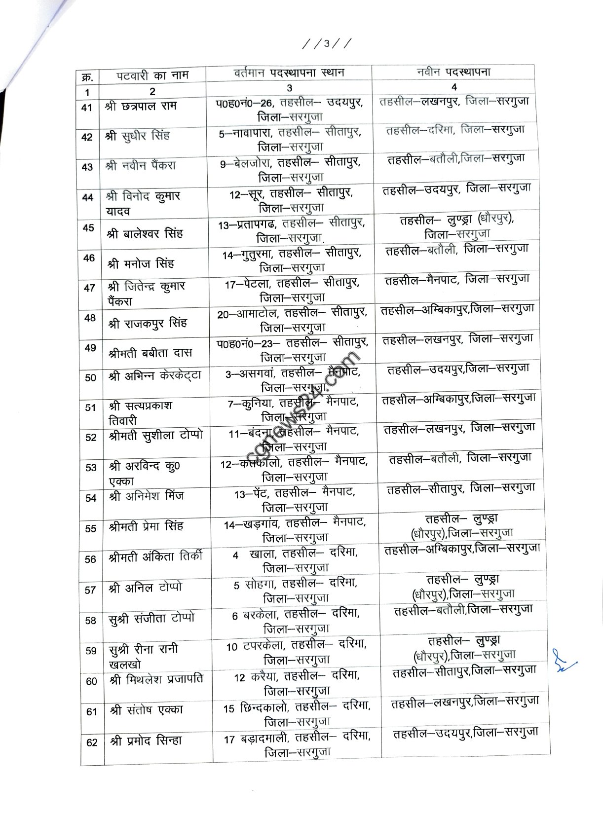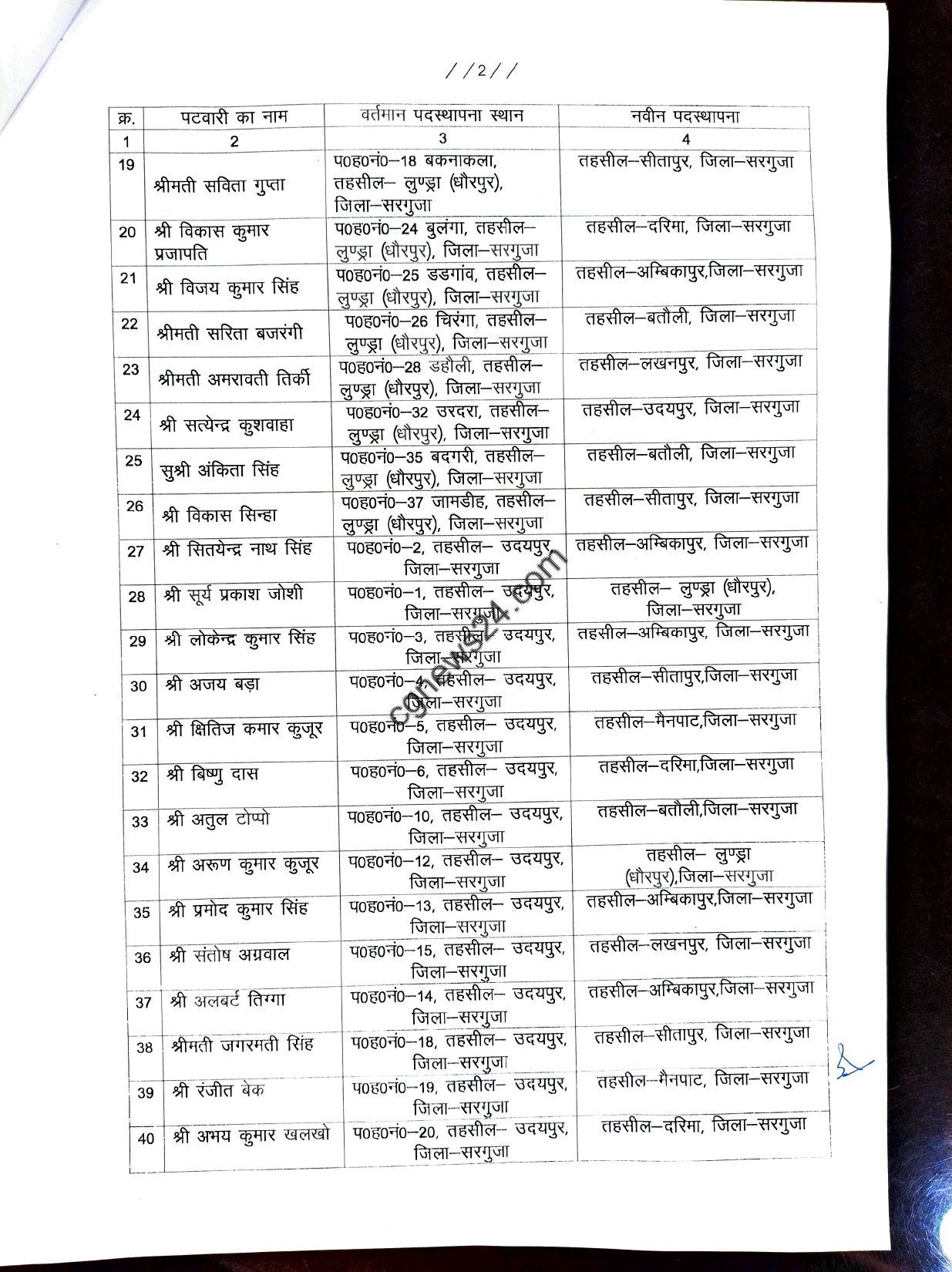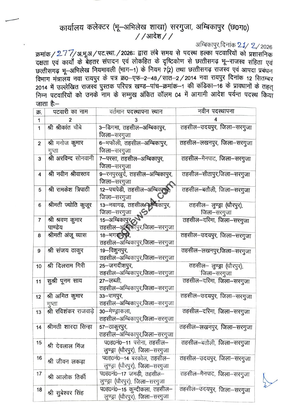 सरगुजा, 21 फरवरी 2026। कलेक्टर अंबिकापुर द्वारा जारी आदेश के तहत जिले में पदस्थ कई पटवारियों का तबादला किया गया है। यह आदेश छत्तीसगढ़ भू-राजस्व संहिता, भू-अभिलेख नियमावली (भाग-1) के नियम 7(2) तथा राजस्व पुस्तक परिपत्र के प्रावधानों के अंतर्गत जारी किया गया है।